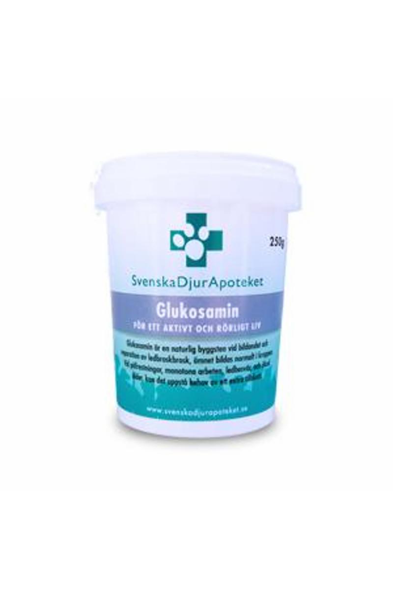 Svenska DjurApotekets Glukosamin är det mest vanliga ledpreparatet på marknaden idag för att bromsa utvecklingen av atros. Glukosamin hjälper till att bevara friskt brosk och stimulerar nybildningsprocessen av skadat brosk. Svenska DjurApotekets Glukosamin innehåller även inulin som hjälper ditt djur att få ett bättre upptag av glukosamin. Många djur har, eller får med åldern, problem med sina leder. Ledinflammationer leder till smärta, försämrar livskvalitén och minskar djurets livsglädje. Ledsjukdomar drabbar oftast äldre djur men även unga djur kan drabbas. Man vet att höftledsdysplasi, armbågsledsartros och osteochondros leder till kronisk inflammation i den drabbade leden. Även övervikt och felställningar kan öka belastningen på lederna. Om man vill få ut maximal effekt så rekommenderar vi att man kombinerar glukosamin tillsammans med Svenska DjurApotekets MSM och Laxolja. Ingredienser: Glukosaminsulfat(från snäckskal) 2kcl, inulin, Kalciumakorbat (C-vitamin), Deklaration per dosmått á 0,8 g (1 ml) •Glukosamin 550 mg •Inulin 200 mg •C-vitamin 20 mg Glukosamin Dosering Blandas i maten en gång/dag. Doseringsmått medföljer i förpackningen Räcker ca: 120g 250g Katt och liten hund upp till 10 kg Ett dosmått/dag 150 dagar 312 dagar Hundar mellan 10-25 kg Två dosmått/dag 75 dagar 156 dagar Hundar mellan 25-40 kg Tre dosmått/dag 50 dagar 104 dagar Hundar över 40 kg Fyra dosmått/dag 38 dagar 78 dagar
